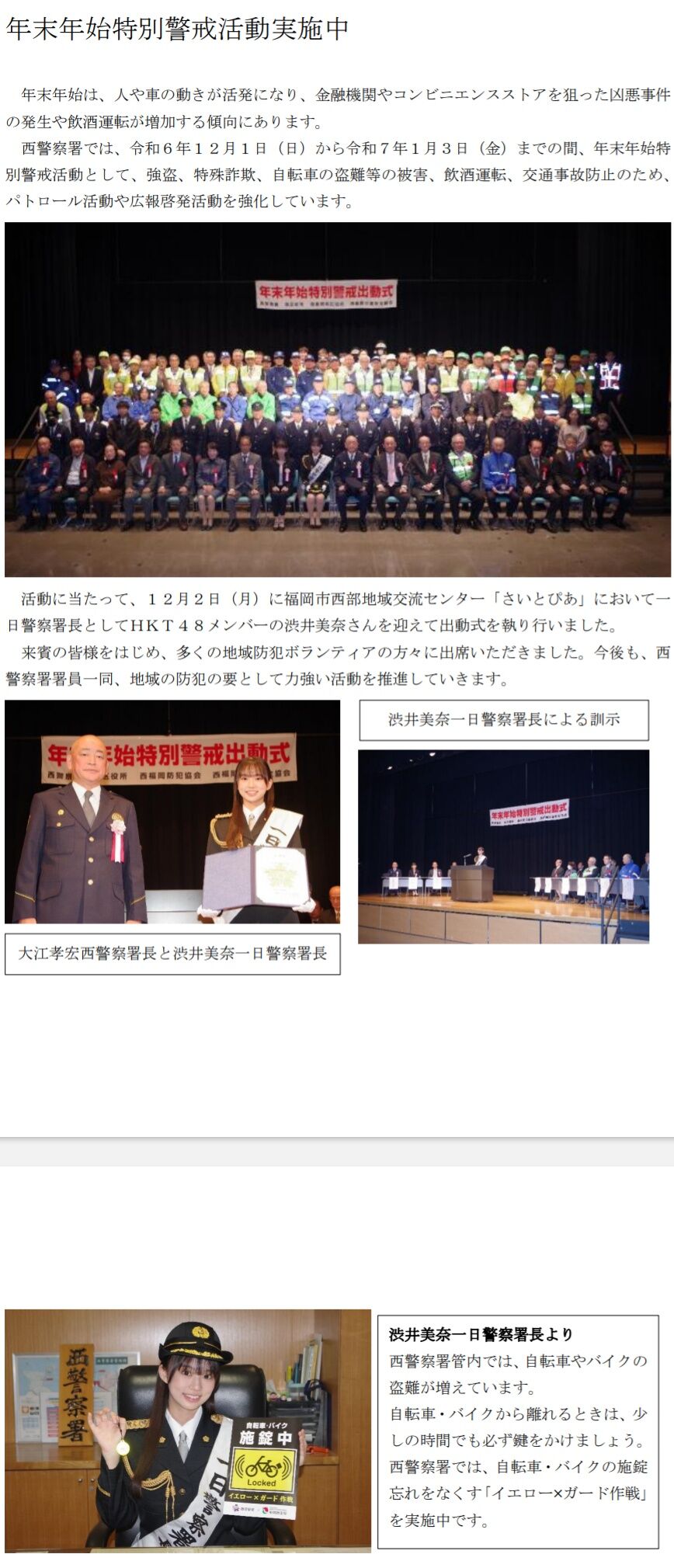 12月2日に福岡市西部地域交流センター「さいとぴあ」で行われた年末年始特別警戒出動式に西警察署の1日警察署長として #渋井美奈 が出席させていただきました😊