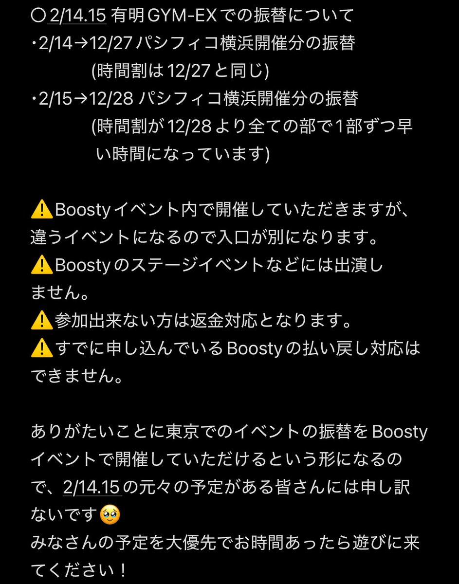 ※振替会場は同日に開催を予定しております『Boosty Winter Party 2026』と同会場となります。また、入退場口は異なり、ご入場にはお時間が掛かりますので、あらかじめ余裕を持っていただくようお願いいたします。なお、『Boosty Winter Party 2026』イベント内でのコンテンツ出演は予定しておりません。